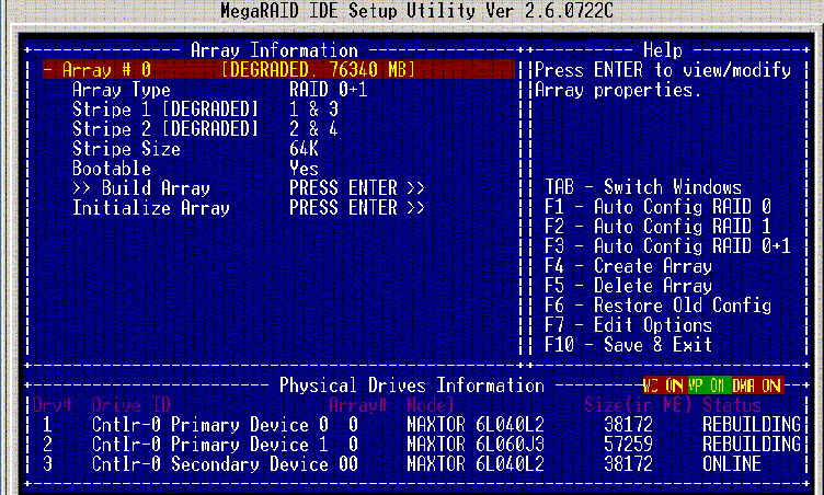 三、阵列的重建: 1、启动服务器,并在看到Press Ctrl+M to run MegaRAID IDE Setup Utility信息出现时,按Ctrl+M进入配置界面; 2、按F4选择手动配置阵列; 3、将Array Type更改为Mirror; 4、将现有的硬盘和新添加的硬盘都加到这个阵列中,可以通过硬盘所连接的位置识别哪个是现有的硬盘,哪个是新添加的硬盘; 5、按回车启动rebuilding重建进程,设置程序会提示选择目标硬盘名; 6、按空格键选择新添加的硬盘作为目标硬盘,并按回车; 然后重建进程开始,如果在阵列重建过程中出现任何的错误,会谈出一个提示信息窗口,用户可以选择忽略这个错误并继续,或选择停止重建进程。 注意:如果需要使重建进程加快,可以按F7启用DMA Read/Write功能。