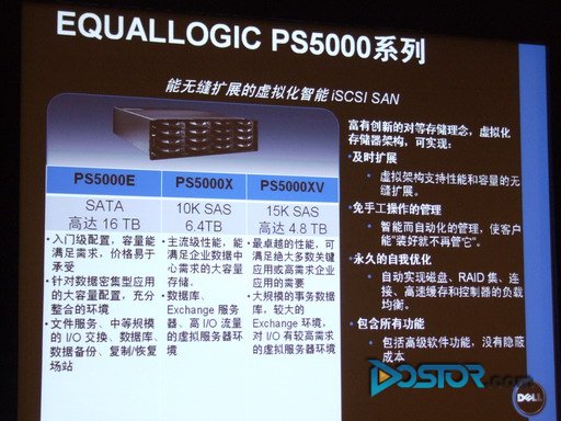 PS5000是戴尔公司半年来发布的第二款存储产品,与上一次发布的MD3000i颇为相同的是,PS5000仍然是一款iSCSI存储产品--当然,这是再正常不过的事情,EqualLogic在被戴尔收购前是全球第二大iSCSI存储产品提供商。